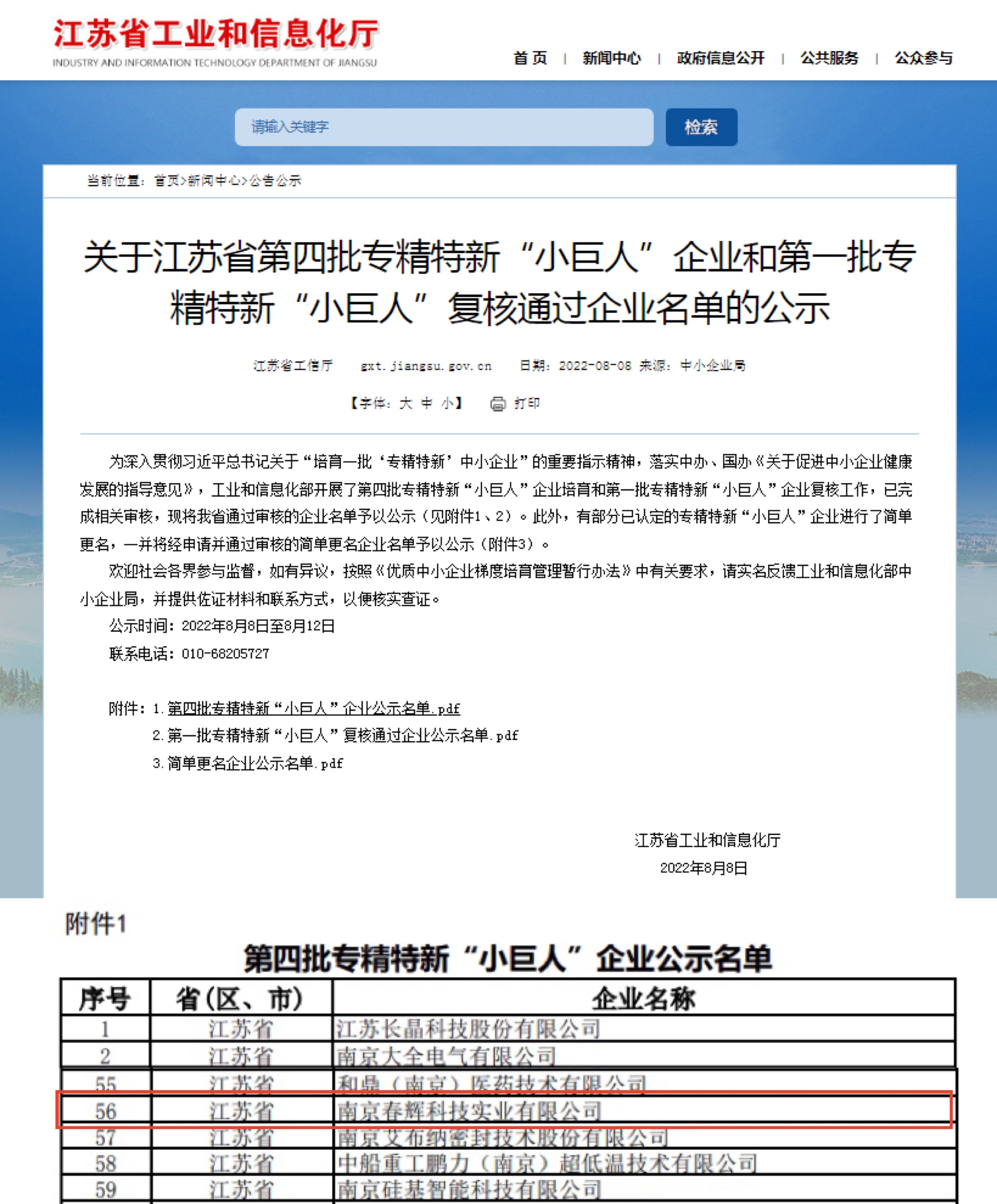 為深入貫徹習(xí)近平總書記關(guān)于“培育一批‘專精特新’中小企業(yè)”的重要指示精神,落實中辦、國辦《關(guān)于促進(jìn)中小企業(yè)健康發(fā)展的指導(dǎo)意見》,工業(yè)和信息化部開展了第四批專精特新“小巨人”企業(yè)培育工作。2022年8月8日,江蘇省工業(yè)和信息化廳公示了全國第四批專精特新“小巨人”企業(yè)名單,南京春輝科技實業(yè)有限公司脫穎而出,被認(rèn)定為國家級專精特新“小巨人”企業(yè)。